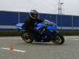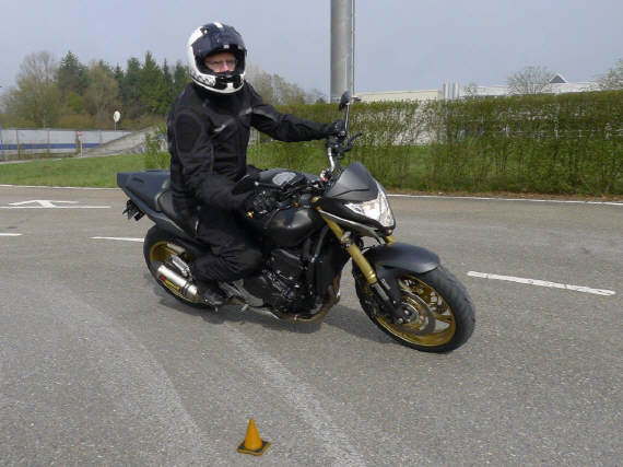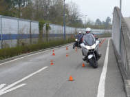 Beim Einfahren (es bizzli Kürvli fahren) zum Auflockern und Reifen anwärmen, konnten wir die Bodenbeschaffenheit etwas studieren. Im Laufe der Zeit hatte der Belag gelitten und offenbar waren auch Winterschäden noch nicht behoben. Daneben gab es stark Salz-verschmutzte Flecken, genau auf der Fahrspur, die wir normalerweise für das Schräglagentraining nützen. Dies machte zusammen mit den Bodentemperaturen knapp über dem Gefrierpunkt nicht wirklich Mut für «verschärfte Schräglagen» in der Kreisfahrt. So beschlossen wir, nach dem Einfahren erst mal ein bisschen stabilisierende Langsamfahrübungen zu machen. |