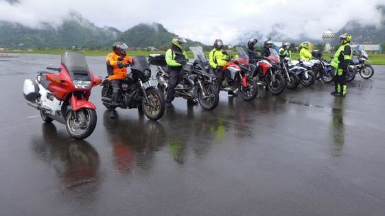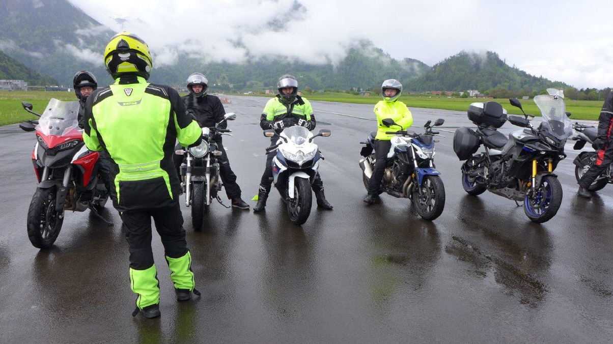 Als wir heraustraten, war es noch kein bisschen besser: Der Regen dürfte uns den ganzen Morgen begleiten, dachten wohl alle. Wegen des Regens gibt es kaum Fotos vom Morgenprogramm, da ich praktisch beim ganzen Programm mitgefahren bin. Neben einer nassen Linse gibt's auch keine spektakulären Bilder von Schräglage - was sollen dann stehende Bilder ausdrücken? So machten wir verschiedene Fahrübungen, aber halt wenig spektakulär, da sich ja niemand auf die Schnauze legen wollte. Erst nach der Znünipause liess der Regen nach und die Sonne drückte etwas aus dem grauen Deckel.