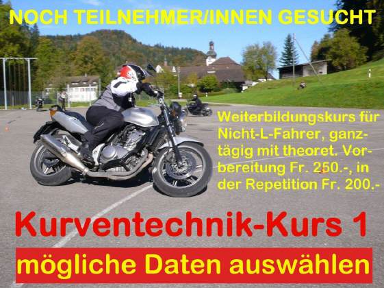 Der nächste Kurventechnik-Kurs 1 ist am Freitag, 31.März und/oder 1.April 2017 geplant. Es hängt ganz von den Teilnehmern ab, wann wer kann und wieviele es schliesslich sind. Wer den Kurs als Repetent besucht, muss die Theorie nicht zwingend besuchen. L-Fahrer/innen oder Weiterbildungsteilnehmende in der Repetition bezahlen nur Fr. 200.- ohne Theorie.