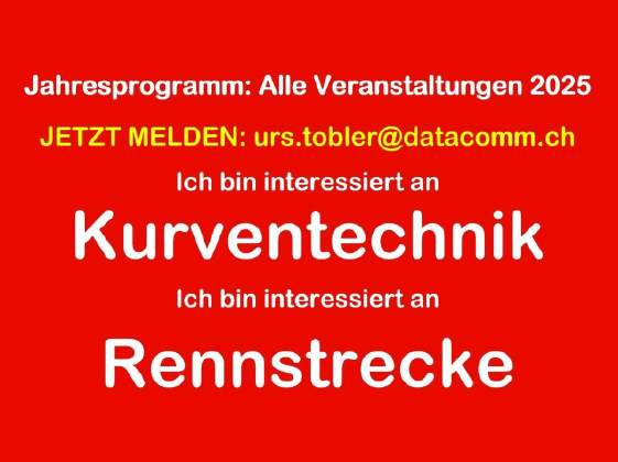Am 7.Febr. geht das Mail raus: Ich muss (falls es genügend Interessenten, mind. 6) für den KT2-Kurs das Str.V.amt in Zug reservieren, ebenfalls muss ich zu den anderen Veranstaltungen wie WB-Kurs Interlaken, versch. Rennstrecken-Trainings Eure Wünsche haben, um den definitiven Kalender festzulegen! Mail an urs.tobler (at) datacomm.ch