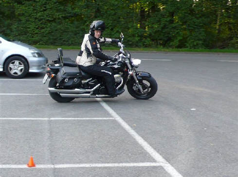 Eingangs der Kurve: Bilck zur Pylone, an der Pylone mit Blick und mit Töff bleiben, etwa in der Mitte Blick lösen und zum Ziel schauen! Dadurch kippt der Töff und mit Gas und Kupllung wird der Töff aus der Kurve herausgenommen. Blickt der Schüler anderswo hin, geht es nicht eng um die Kurve, blickt er auf den Boden: Augenblicklich wird der Fuss abgesetzt! Bild rechts: Detailansicht vom dritten Bild, Blick wandert weg von der Pylone - die Kurve wird weiter! |
