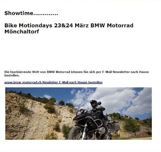 Auf dem Gelände des Flugplatzes «Speck» in Fehraltorf finden mit unserem langjährigen Sponsor «Müller+Jussel» BMW-Testtage statt. Urban Jussel hat mir als Kunde ein E-Mail gesandt, welches ich gerne weiterleite. Hier hat man die Möglichkeit verschiedene BMW-Motorräder zu testen, um sie im Umkreis auf den Landstrassen des Zürcher Oberlands zur Probe zu fahren. Viel Spass dabei! Hier landest Du direkt auf der Webseite von «Müller+Jussel» |