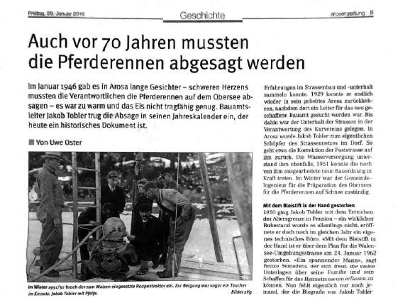 in der Aroser Zeitung zu unserem Grossvater Jakob Tobler-Weber, der als Eismeister im Jahr 1946 die Pferderennen auf dem Obersee verbieten musste, da das Eis zu wenig mächtig war, um eine sichere Durchführung zu gewährleisten. 2016 wurde das als Folge des Klimawandels dargestellt, doch 1946 war der Winter auch lau, die Temperaturen lagen zu hoch für die Eisbildung. Bei einem Ausflug aufs Weisshorn stellte sie fest, dass dort das Panorama unseres Grossvaters fehlte: Ob es wohl überlebt hat? Dies war der erste Kontakt mit den Aroser Bergbahnen, wo ihr Mail auf dem Konto des CEO Philipp Holenstein landete. |