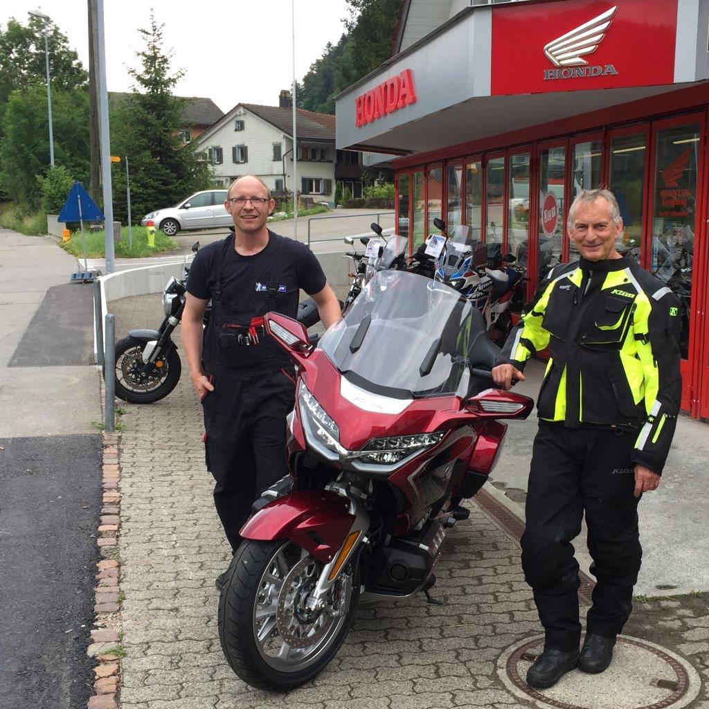 Am Freitag, 6.Juli übernahm ich mietweise eine nigel-nagel neue GoldWing Tour GL1800 DA mit DCT-Technik mit einem Km-Stand von 63 km bei Honda-Keller in Bauma, wo ich 1985 meine letzte GoldWing, eine GL1200 Aspencade gekauft habe. Im Bild: Der «neue Chef» Ivan Eberle, der die Nachfolge von Hans Keller angetreten hat, bei der Übergabe. Als ich die Maschine 3 Tage später wieder hinstellte, stand der Tacho bei 1523 Kilomter - rechne!
