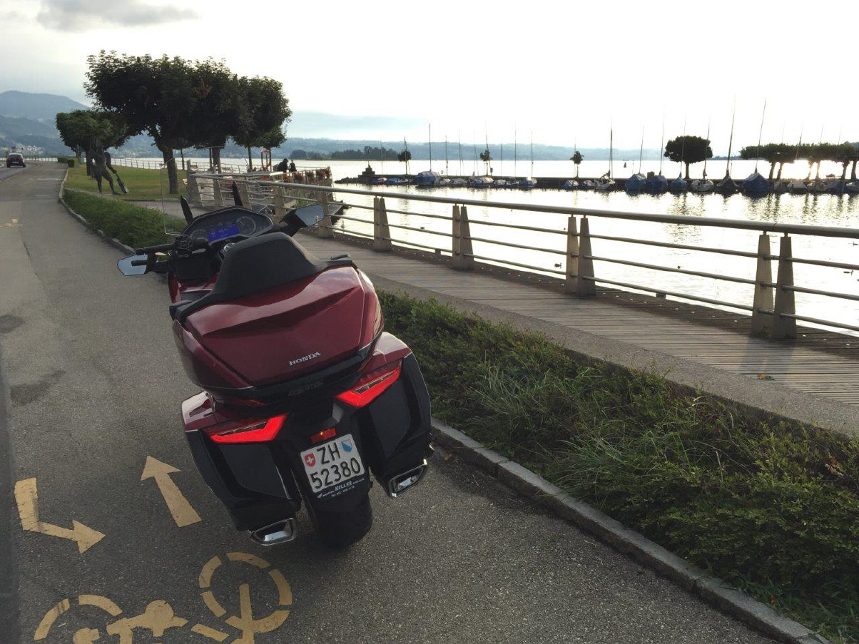 In Rapperswil hielt ich an um eine Mitteilung nach Hause zu senden: Der Abend war noch lang und ich konnte keinesfalls den Töff bereits um 8 Uhr parkieren. Als ich in Thalwil um die Ecke bog, stand Karin bereits in voller Montur bereit, aufzusteigen. Auch sie konnte es kaum erwarten, hatte ich doch so geschwärmt von dieser neuen Maschine, als ich sie am 18.April beim GoldWing-Center Oftringen das erste Mal zur Probe fuhr. (Bilder und Bericht auf meiner Homepage) |