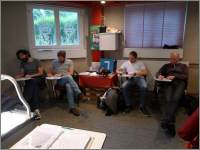 In der Theorie am Montag nahmen nicht nur die beiden englisch sprechenden Teilnehmer, Andrew, ein Schotte (WB-Teilnehmer) und Sebastiano, ein Italiener (in der Töff-Ausbildung) teil, sondern auch die beiden Fahrschüler, Bartosz und Petr waren «mit im Boot»: Sie werden dann wahrscheinlich Ende Juli den KT1-Kurs besuchen. |