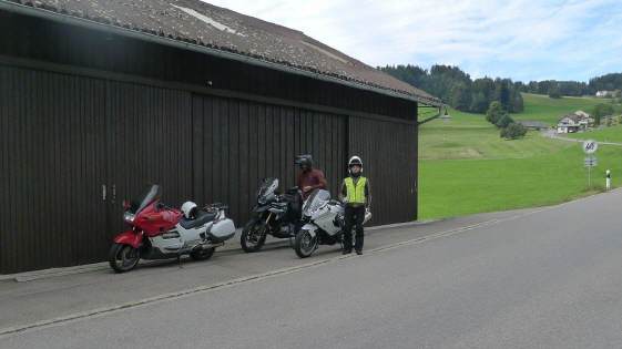 Als wir aus dem Restaurant traten, nieselte es etwas: «Dry rain» nennt dies der Engländer, weil die Strasse nicht richtig nass wird und der Regen auf den Kleidern vom Fahrtwind fortwährend trocknet. Noch einmal war eine Runde angesagt, um mit verschiedenen Lenktechniken zu spielen, bevor wir uns ins Gelände begaben: Flucht ins Gelände war angesagt! Was machen, wenn auf der Strasse kein Platz übrig bleibt? Lieber weg von der Strasse als ein Crash riskieren. |