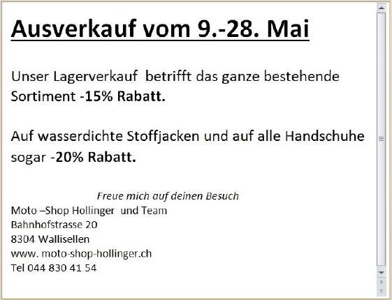 Auf meiner Internet-Seite www.moto-shop-hollinger.ch kannst du alles genauer nachlesen. Würst, Kuchen, kleiner Wettbewerb erwartet dich am 18.8.07 ab 8.00 -17.00 Uhr. Auf deinen Besuch freuen sich das ganze Team.