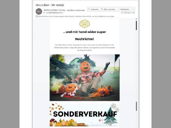 Am 29.Sept. kam dieses E-Mail vom Moto Corner Fun, wie der "Moto Corner" jetzt heisst, seit Nic Cadruvi übernommen hat. Das ganze E-Mail in voller Länge als PDF [6'096 KB]