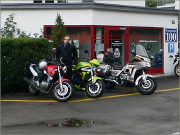 Genau um 19.30 Uhr trafen wir in der Waldegg ein. Dort wartete «Kuki»: Sie ist schon ein paar Mal mit ihrer CBR 600 F mitgekommen, verzichtete aber dann in Anbetracht der Sachlage! Ich hatte Adam versprochen, in diesem Fall mit im Prüfungsgebiet die verschiedenen Höger zu befahren, was wir dann auch taten. |