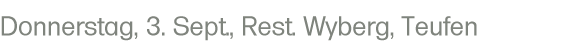 Um 19 Uhr erwarten Dich Arthur und Urs, die sich für die Teilnehmer aufteilen: Walter löst ein Welness-Geschenk im Appenzellerland ein, steht also nicht zur Verfügung, genauso wenig wie Oliver. Wir planen nochmals eine Fahrt ins Zürcher Weinland! Auf dem Rückweg machen wir halt im «Wirtshus zum Wyberg» in Teufen. So ist die Rückfahrt in die Region Zürich nur noch etwa eine halbe Stunde. Da es bereits um halb 9 Uhr finster ist, werden wir auch nicht später im Restaurant eintreffen.