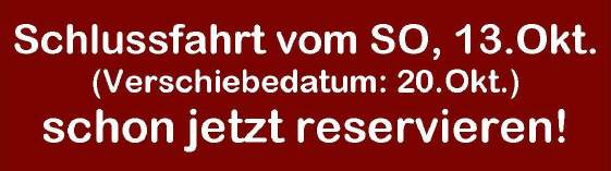 Die Schlussfahrt in diesem Jahr wird wie gewohnt auf den ersten Sonntag im Oktober fallen, mit Verschiebedatum 2.Sonntag, dem 11.Oktober 2015. Du solltest Dir dieses Datum schon jetzt im Kalender anstreichen. |