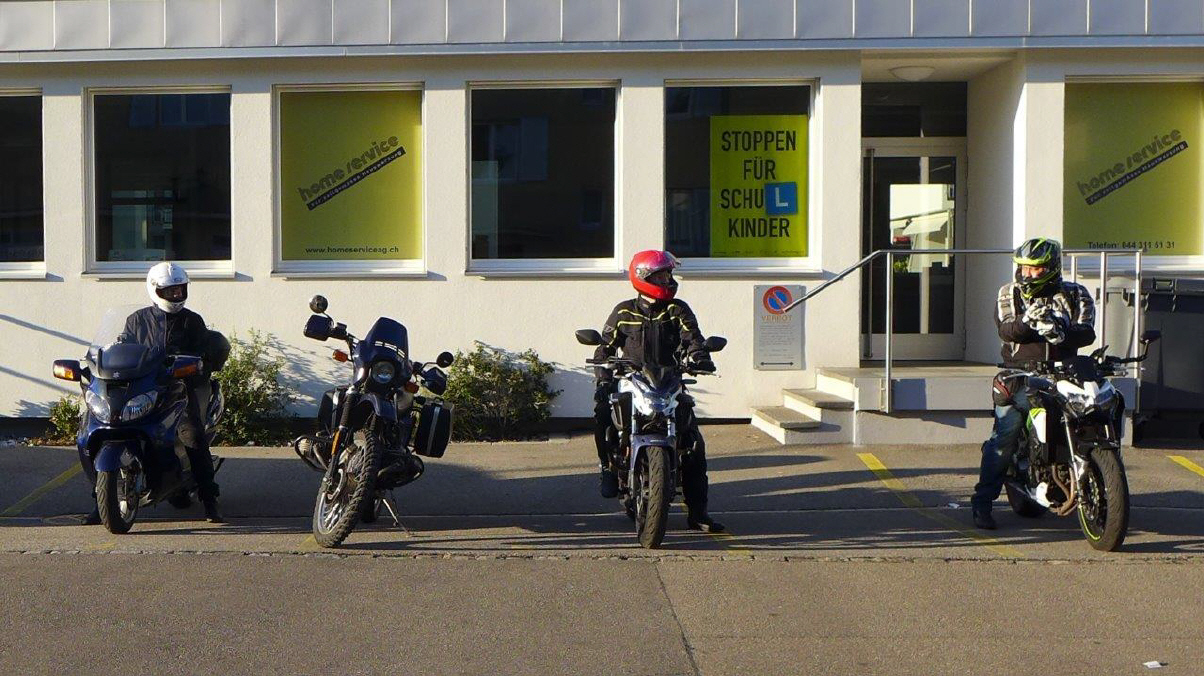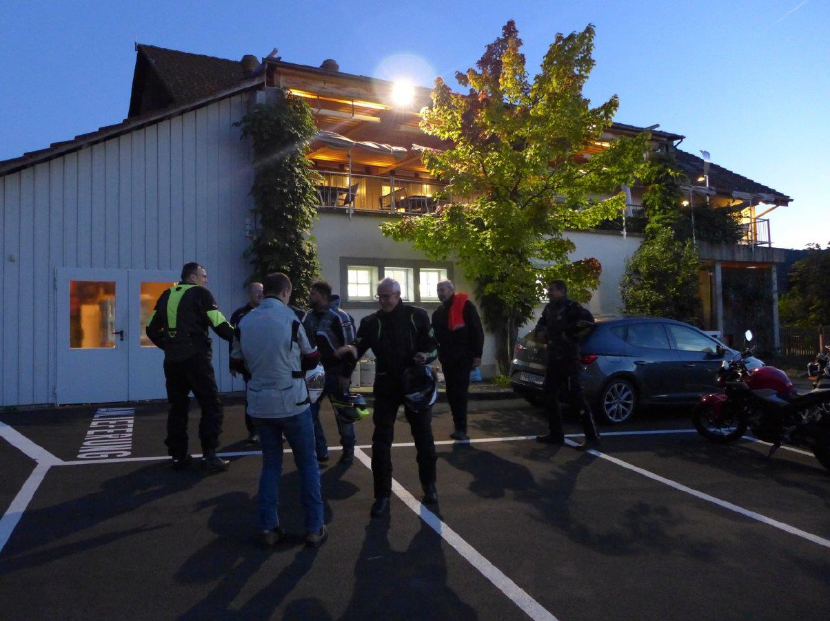 Am Start um 19 Uhr trafen neben den Tourguides Renato und Dominik, Khash und schliesslich Lukasz (nicht im Bild) ein. Wir trafen kurz vor 20 Uhr im Wyberg ein, auf einem komplett neu gestalteten Parkplatz. Kaum hatten wir unsere Maschinen parkiert, traf auch gleich Renato mit seinen Leuten ein. |
