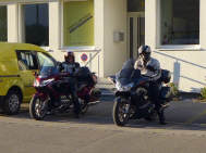 Um 18 Uhr trafen insgesamt, mit uns beiden Tourguides gerechnet, 7 Personen. So entschlossen wir zwei Gruppen zu machen. Arthur, der seit ein paar Wochen mit seiner «neuen» Honda GoldWing Tour unterwegs ist, übernahm Yannis und Mircea. Sie starteten zuerst. Ich hatte in meiner Gruppe Ionut mit der CB500F und José mit seiner Kawasaki Z900. Beide hatten vor einem Jahr die "grosse" Prüfung absolviert. Beat auf dem Suzuki Roller, der seit Jahrzehnten dabei ist und sich diese Gelegenheit nicht entgehen lassen wollte, machte in meiner Gruppe den Schluss.