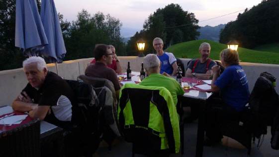 Nachdem wir alle geparkt hatten, begaben wir uns ebenfalls auf die Terrasse. Es war ein lauer Sommerabend. In diesem Moment traf als letzte Gruppe die bereits um 18 Uhr gestartete Gruppe Arthur und Roman ein. Neben Alain's Frau Sylvie war auch Roman's Lebensgefährtin Regula als Soziusfahrerin dabei. So waren wir wieder mal eine «Riesentschuppelete» von TeilnehmerInnen zusammen und erlebten einen wunderbaren Abend. Die Kücke war nicht «fast», aber das Essen (wie immer) überaus fein. Eine gute Adresse, auch ausserhalb unseres Programms mal Halt zu machen.