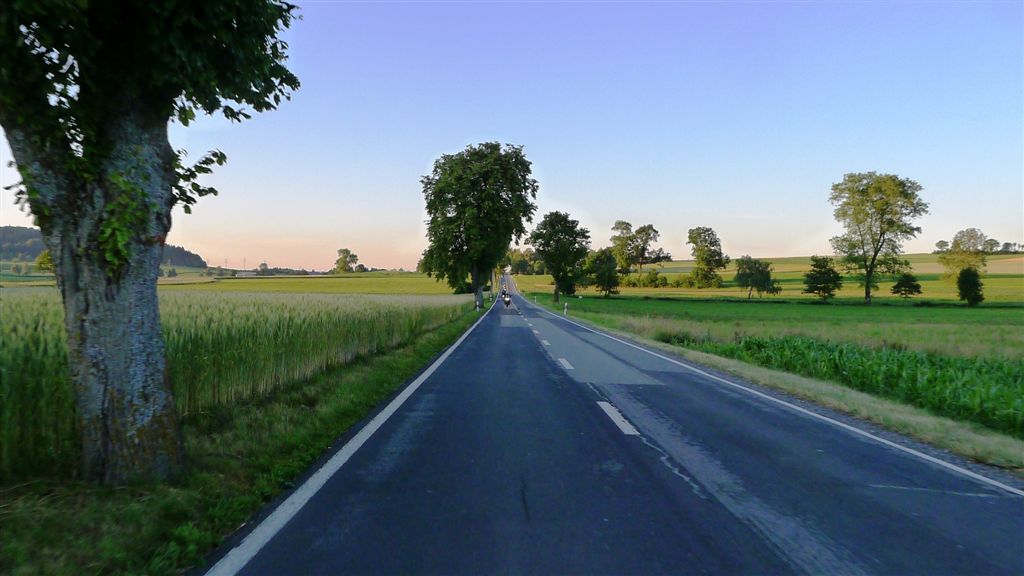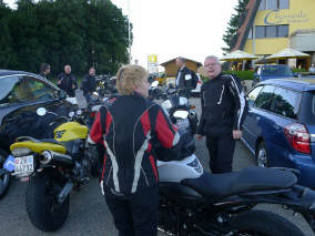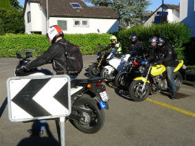 Die Fahrt durch die Stadt Zürich ging zügig über die Runden: So trafen wir pünktlich kurz vor halb acht Uhr ein. Wir teilten die Fahrer auf: Roman fuhr zusammen mit Sigrid und Ernst, ich übernahm die L-Gruppe, bzw. die langsameren Fahrer mit Frank, Gion sowie Silvio und als Schlussfahrer der 79jährige (!) Dietmar. Unser Weg führte über Landikon, Wettswil nach Islisberg, wo wir auf Roman aufliefen. Über Aesch fuhren wir querfeldein nach Oberwil-Lieli, dann Unterlunkhofen, Rottenschwil, Birri nach Muri. Auf dem direkten Weg über Hämikon Berg nach Hitzkirch, mit einem herrlichen Blick auf den Baldeggersee und die Alpen. Über Ermensee, Mosen ging es nach Schwarzenbach, Beromünster und nach Chommlen. Beim Eintreffen standen noch einige der früheren Ankömmlinge bei ihren Motorrädern.