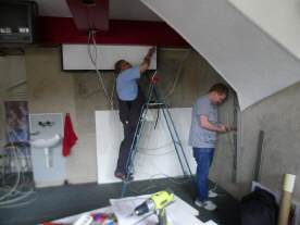 Am Freitag hatten sich zur Mithilfe die Herren Ramseyer, Vater und Sohn, angemeldet: René und Patrick waren vor genau 10 Jahren (2005) bei mir für die Kategorie A1, der Vater prüfungsfrei. Er ist gelernter Elektriker, macht heute aber einen Bürojob – aber für einmal nahm er wieder mal den Schraubenzieher in die Finger und demontierte alles, was mit Strom zu tun hat sowie auch noch die verschiedenen Wandtafeln, Kleinmöbel wie die „Kiste“ des Dia-Projektors, usw. Patrick half noch weiteres Material zu transportieren. |