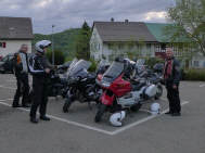 Wir waren die ersten auf dem Parkplatz, gleich danach traf Arthur mit seiner «Automatik»-Gruppe ein: Per Zufall waren alle Motorräder in seiner Gruppe Hondas, ausgerüstet mit der DCT-Technik. Silvio und Urs starteten gleich durch für den Heimweg, während wir übrigen einen feien Znacht im «Wyberg» gönnten. |