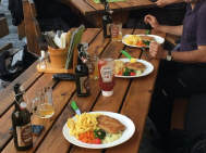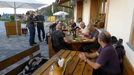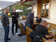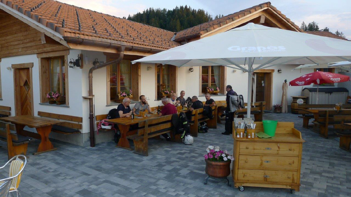 Alle anderen waren rechtzeitig eingetroffen. Bei Renato war auch mein Fahrschüler Tobias auf der Transalp mitgefahren, die beiden brachen gerade auf, um noch bei Tageshelle nach Hause zu fahren. Wir bestellten alle Cordon-bleu, so kam dann die Küche doch noch zu einem verdienten Feierabend, nicht allzu spät, aber eben extra für uns!