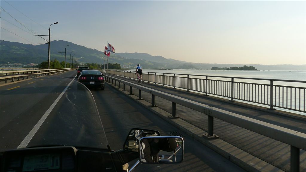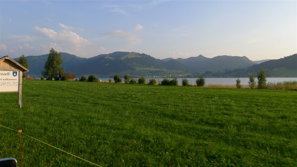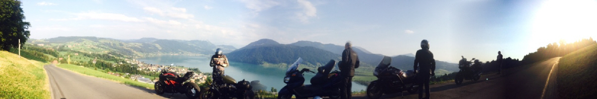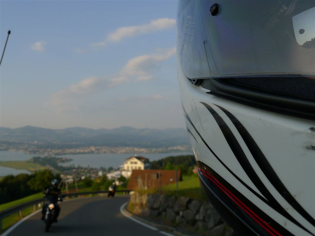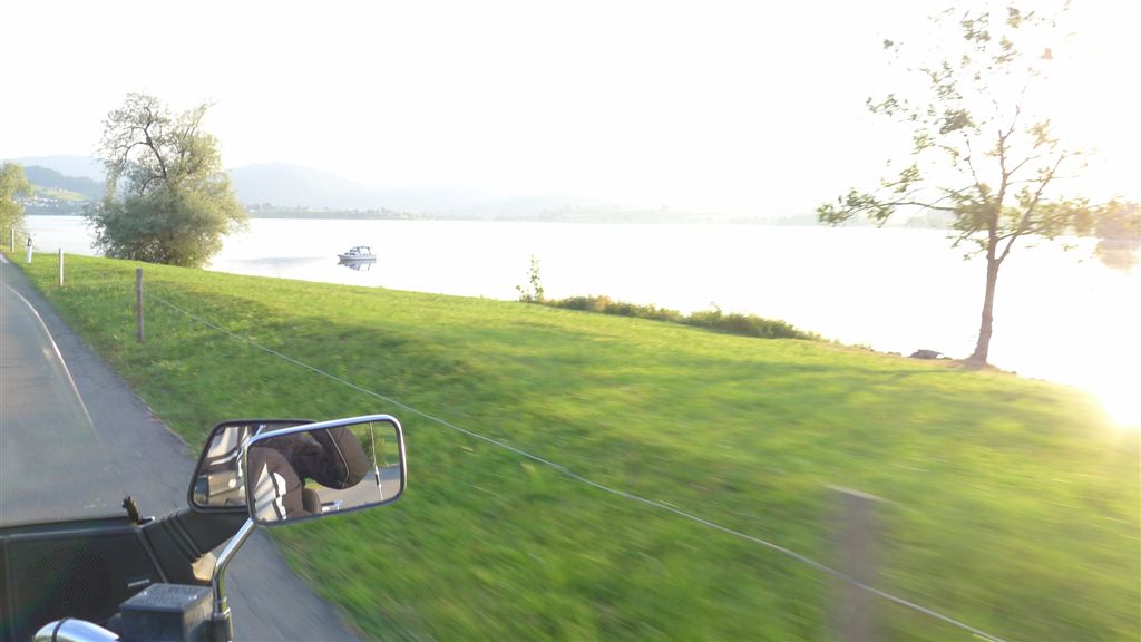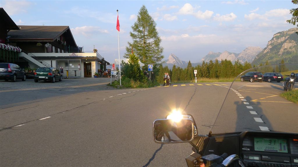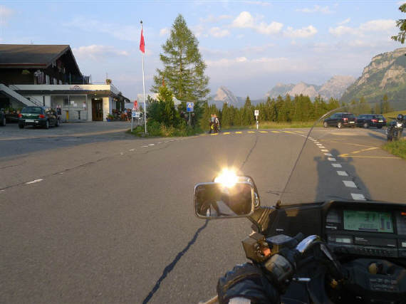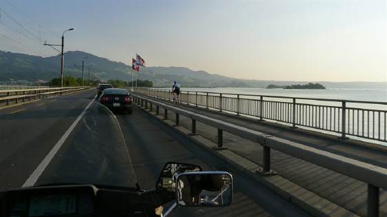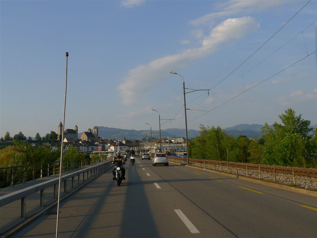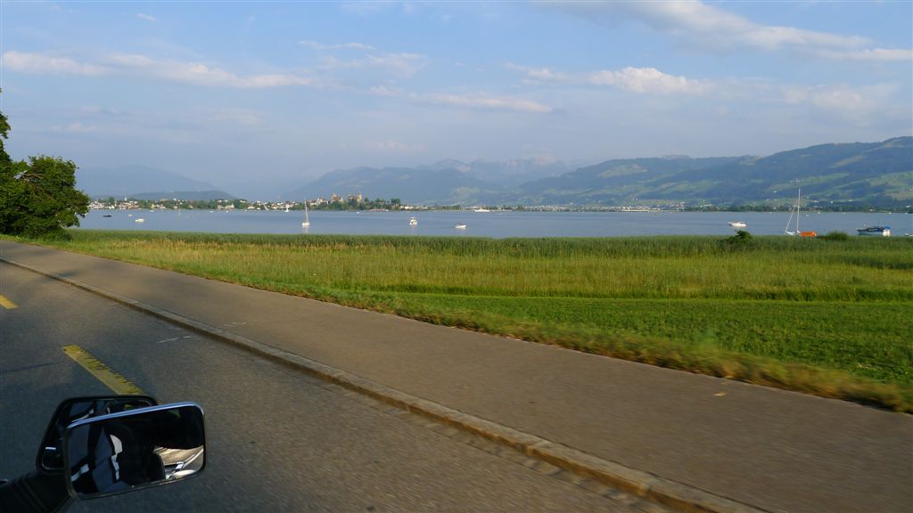 Über Hombrechtikon, Freienbach erreichten wir Rapperswil. Es ist immer wieder ein Erlebnis, wenn man dem See entlang fährt, hinten die Kulisse mit dem Schloss Rapperswil, dahinter die zusammenhängende Alpenkette! Der Seedamm war wegen der Ferienzeit leicht zu passieren. Wir waren trotz Umwegen zeitlich so gut dran, dass wir noch den Etzel, die Teufelsbrücke und entlang dem Sihlsee fahren konnten, um die Sattelegg von Süden her anzufahren. Schliesslich waren wir sogar noch zu früh am Ziel, schon vor halb 9 Uhr!