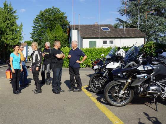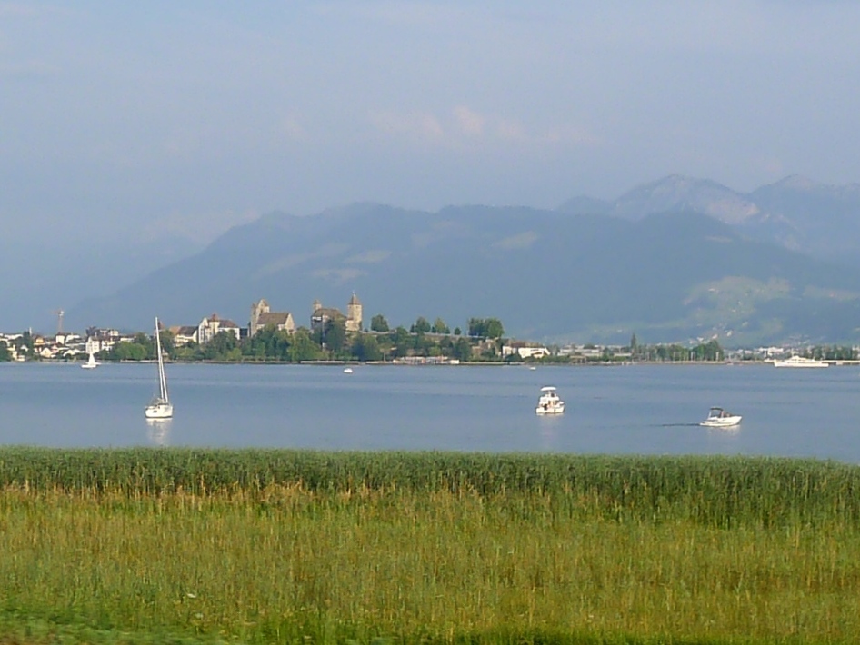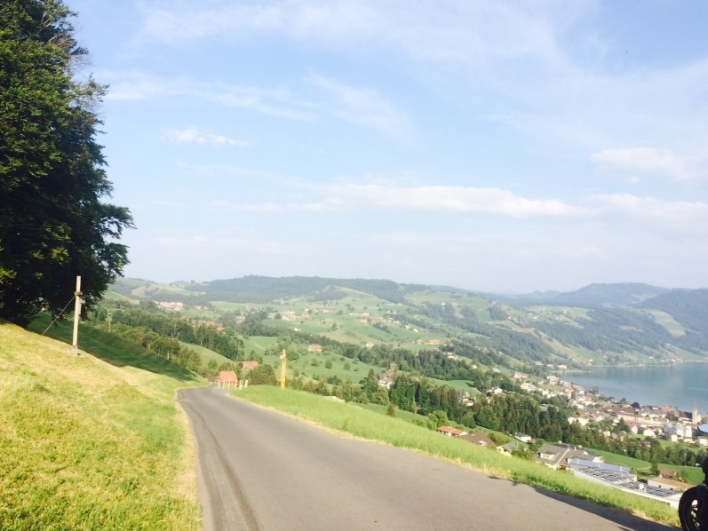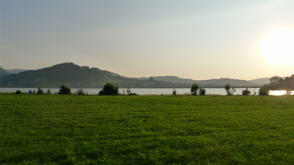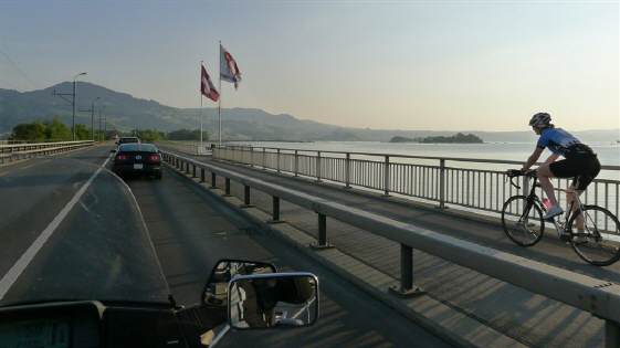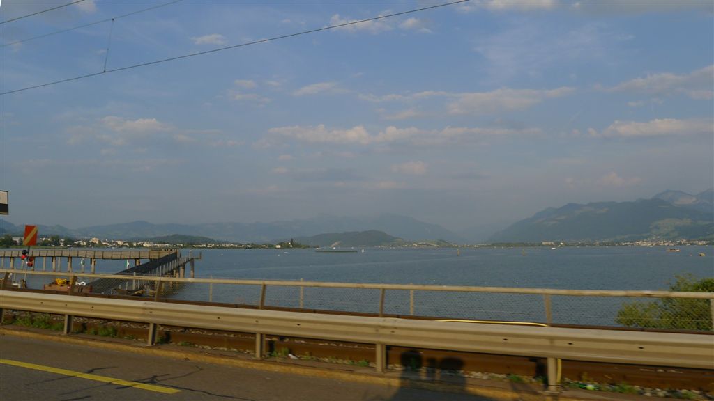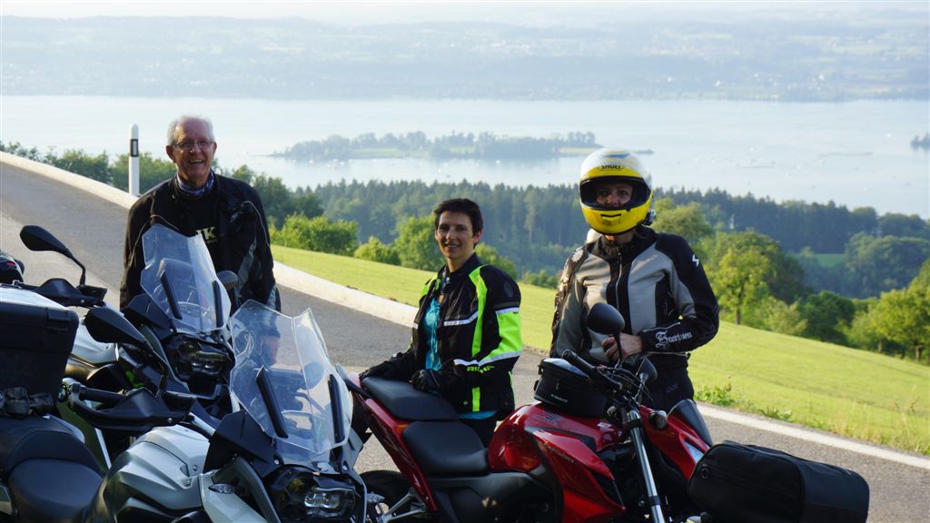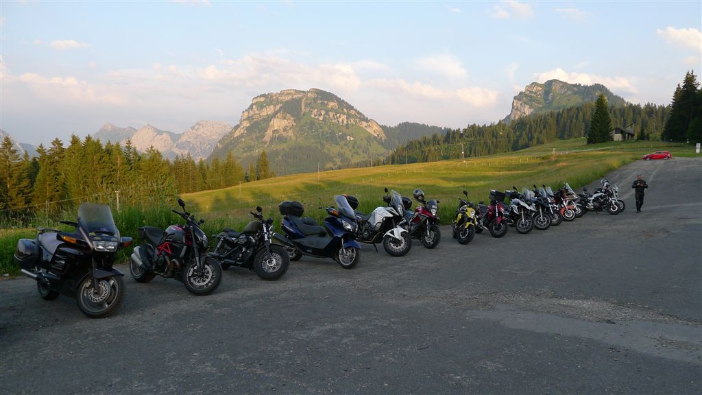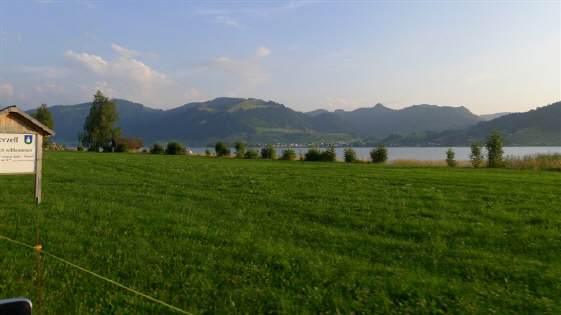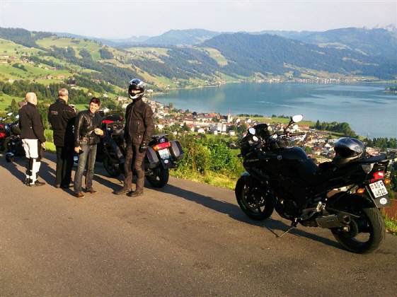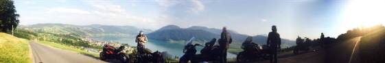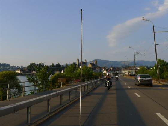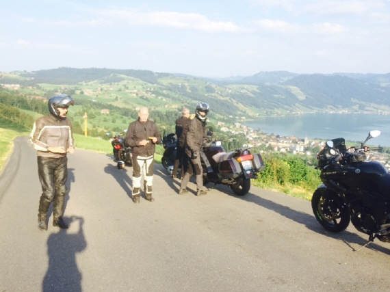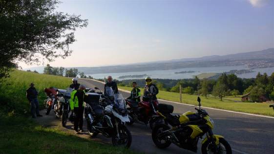 Über Hombrechtikon, Freienbach erreichten wir Rapperswil. Es ist immer wieder ein Erlebnis, wenn man dem See entlang fährt, hinten die Kulisse mit dem Schloss Rapperswil, dahinter die zusammenhängende Alpenkette! Der Seedamm war wegen der Ferienzeit leicht zu passieren. Wir waren trotz Umwegen zeitlich so gut dran, dass wir noch den Etzel, die Teufelsbrücke und entlang dem Sihlsee fahren konnten, um die Sattelegg von Süden her anzufahren. Schliesslich waren wir sogar noch zu früh am Ziel, schon vor halb 9 Uhr!