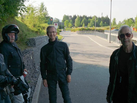Dominik startete mit seiner Gruppe um 18.30 Uhr auf dem Parkplatz vis-à-vis des Park im Grüene, der heutigen Einfahrt zum Migros Rüschlikon. V.l.n.r. Karin, Hürg /mit Helm), Roland und Beat. Schatten-Selfie: Dominik, the photographer!