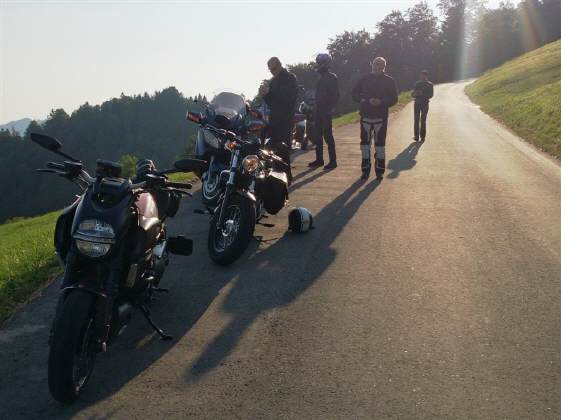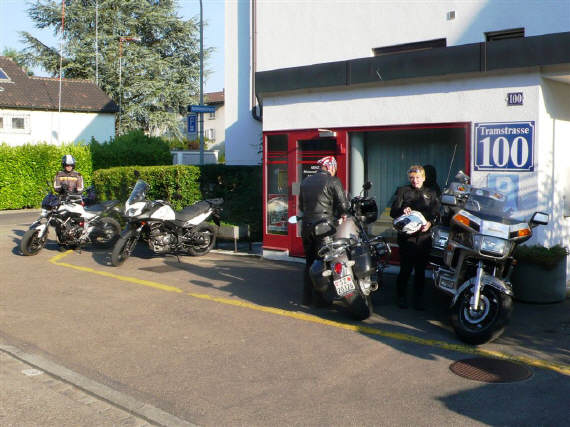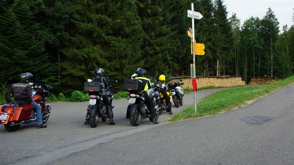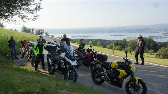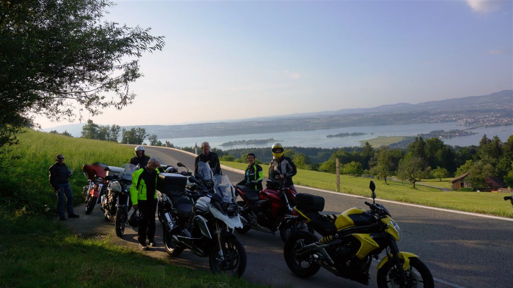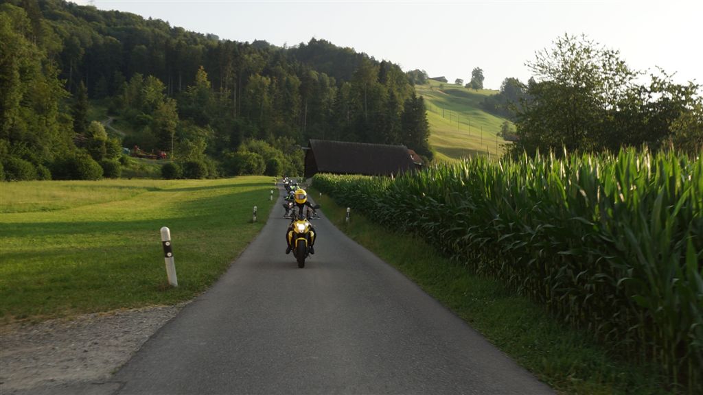 Bei mir, um 19 Uhr, trafen noch drei weitere Fahrer ein: Daniel, mit der BMW Chopper, dann Frank und der aktuelle L-Fahrer Claudio mit seiner MT07. Wir starteten ebenfalls in Richtung Dübendorf, fuhren über Fällanden nach Maur, wo wir in Richtung Egg abbogen. Wegen einer Umleitung landeten wir in Scheuren, von wo es auf den Pfannenstiel und wieder hinunter nach Oetwil ging.