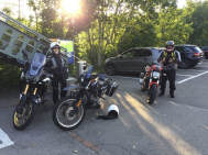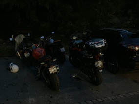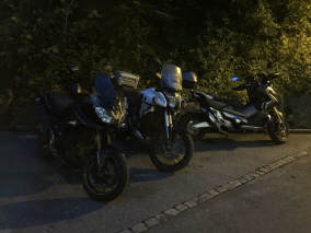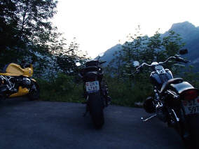 Auf dem Parkplatz auf der Waldegg, den wir in kürzester Zeit (Ferienzeit in Zürich lässt grüssen!) erreichten, wartete Daniel auf der neuen Africa Twin. Seine Entscheidung, mit uns über den Pragel zu starten, war in Anbetracht des Wetters keine gute Idee. Über den Türlersee landeten wir in Sihlbrugg, wo es in Richtung Menzikon weiterging. Wir erreichten diesmal über den Zugerberg (erst Edlibach rechts den Berg runter, dann wieder in Richtung Ägeri den Berg rauf) den Ägerisee, wo bereits dunkle Wolken am Horizont nichts Gutes verhiessen. In Sattel schaute ich erstmals aufs Handy, um zu schauen, ob die Gruppe vor uns eine andere Entscheidung getroffen hatte. Myriam meldete 4 Personen, auf der Höhe Ibergeregg-Pass um 20.18. Ausgangs Schwyz begann es heftig zu regnen und wir retten uns unters Dach einer Tankstelle in Richtung Muotathal. Hier empfing ich kein weiteres SMS, also war die Gruppe vor uns in Richtung Pragel unterwegs. Daniel drehte aufgrund der Wettersituation um - welch gute Entscheidung, ihm blieb viel erspart -, während Claudio und ich uns in einen heftigen Gewitterregen begaben. Es wurde immer schlimmer und auf dem Weg zum Pragel blitzte und donnerte es gar. Dafür hatten wir mit der Passhöhe den Regen hinter uns gelassen und wir fuhren auf nasser Fahrbahn dem Klöntalersee entgegen. In den Waldpartien war es schon recht dunkel, mit dem letzten Tageslicht erreichten wir Riedern und schon bald fuhren wir dem Bergli entgegen. Die Strasse war teils abgetrocknet, immer im Übergang vom Nassen ins Trockene sahen wir 4 Töffspuren. Es dürfte also noch nicht viel Zeit vergangen sein, dass die 4er-Truppe mit Arthur und Alain vor uns eingetroffen war.