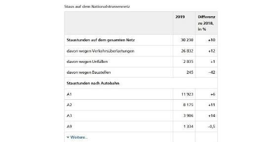 2019 wurden auf den schweizerischen Nationalstrasse 30'230 Staustunden registriert. Gegenüber 2018 entspricht dies einer Zunahme um 10%.