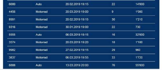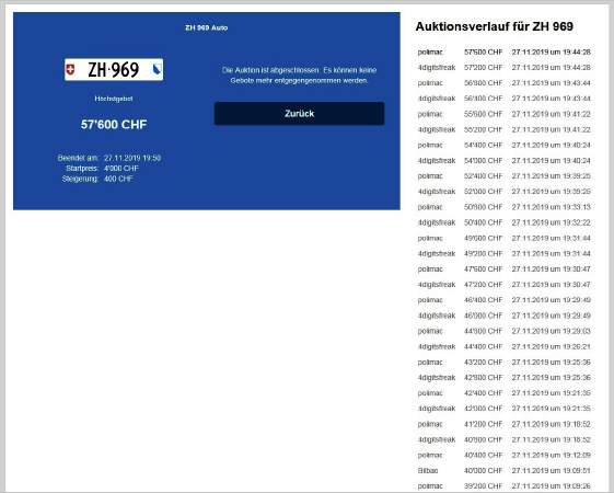 Es ist allein schon interessant, dies zu beobachten. Wenn man sich beim Strassenverkehrsamt einschreibt, bekommt man (wie ich) jeden Montag ein E-Mail zum Einloggen! Passieren tut es dann jeweils am Mittwochabend um 23.00 Uhr - aufgepasst, mitbieten ist gefährlich, Du könntest in den Rausch kommen. Also nur solange mitbieten, als es nicht (oder nur ein bisschen ...) weh tut!