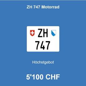 Am 1.5.2019 wurde im Kanton Zürich das vierte 3-stellige TÖFF-Nummernschild ausgegeben - in der Auktion dem Höchstbietenden: Verfolge den Verlauf «ZH 747» bei diesem Schild, welches immerhin einen Erlös von Fr. 5'100.- erzielte -, heute erzielen 3-stellige Autonummern jeweils um die 20'000 Franken - mehr dazu hier