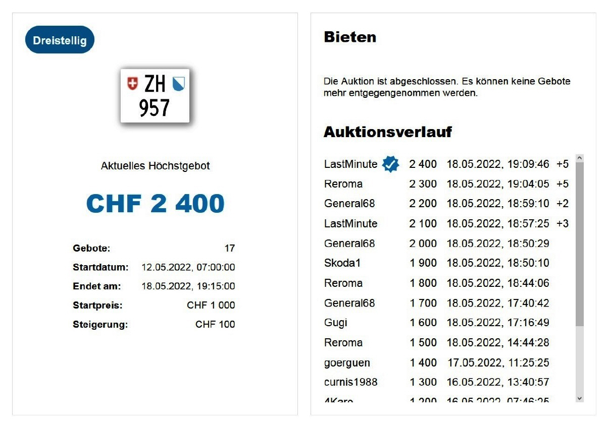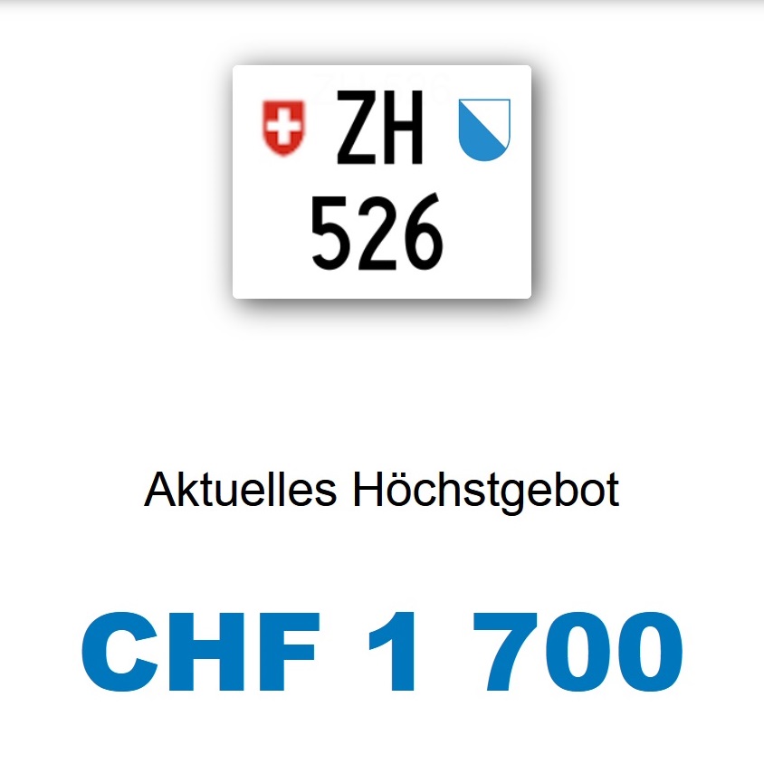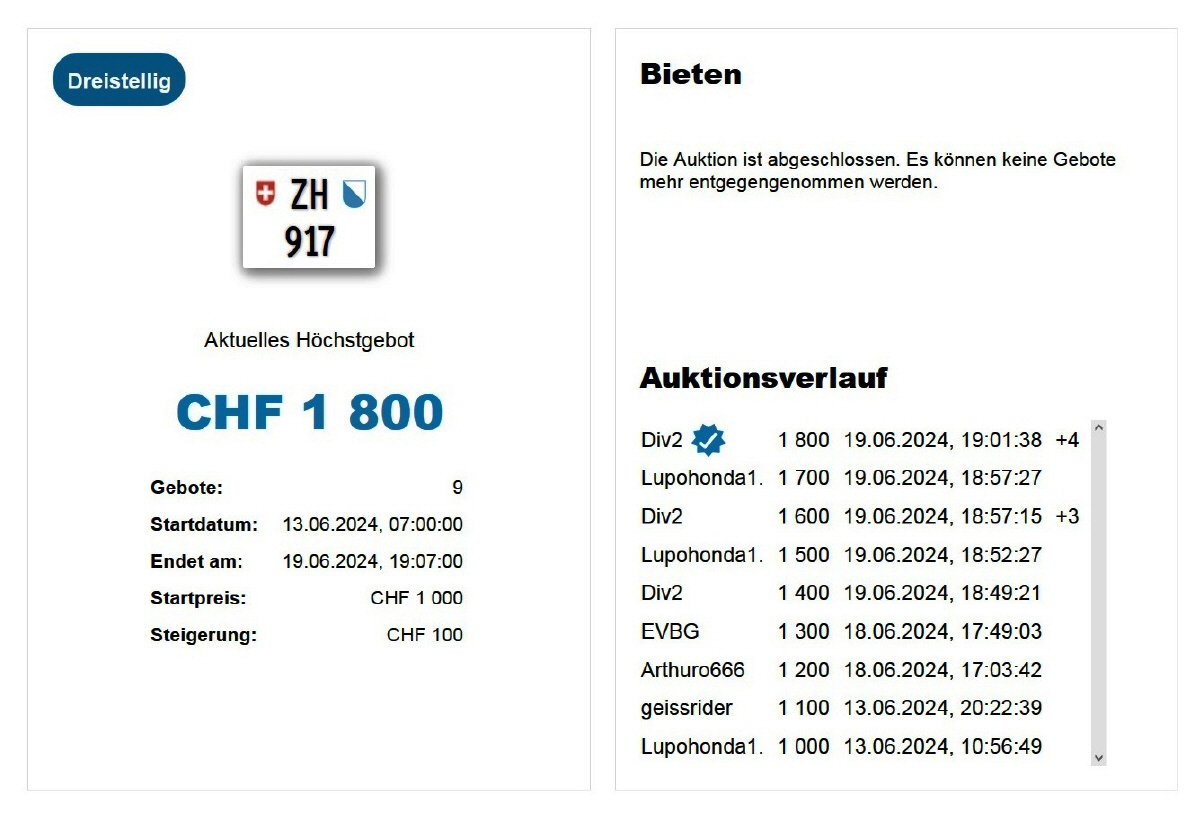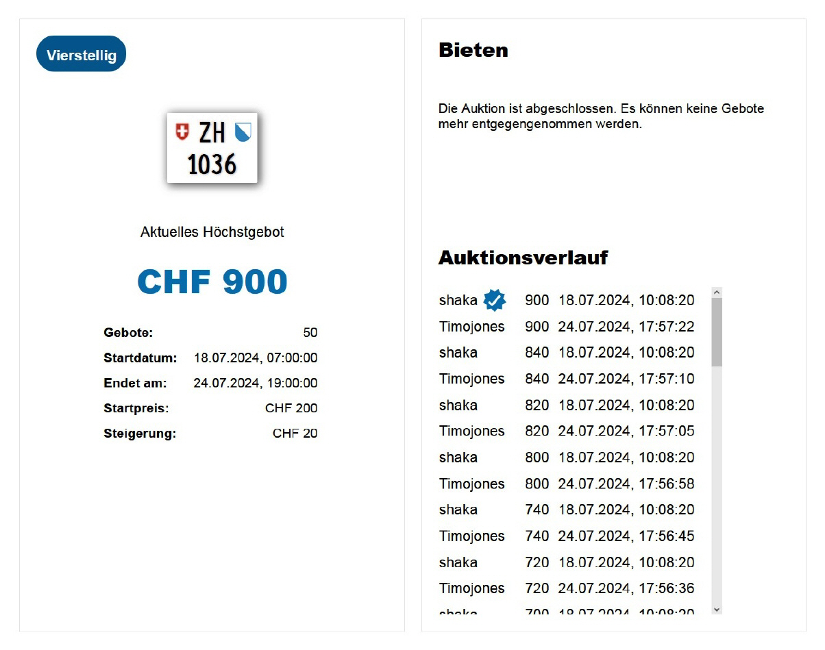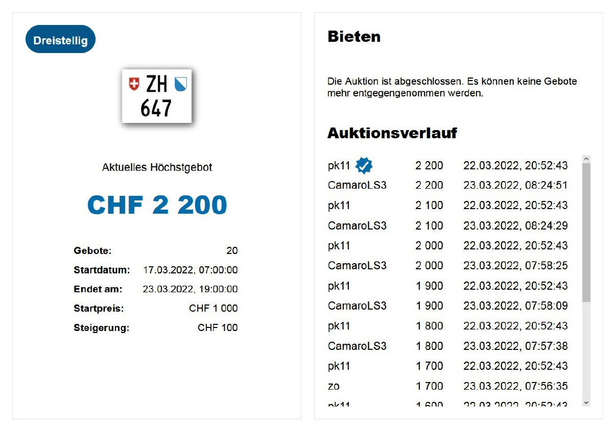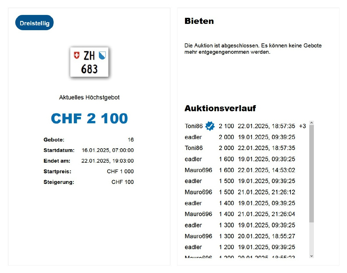 Am 25.11.2020 wurde im Kanton Zürich das 3-stellige TÖFF-Nummernschild ausgegeben - in der Auktion ging es für Fr. 4000.- weg: Auch hier boten sich zwei Bieter hoch! Verfolge den Verlauf vom «ZH 701