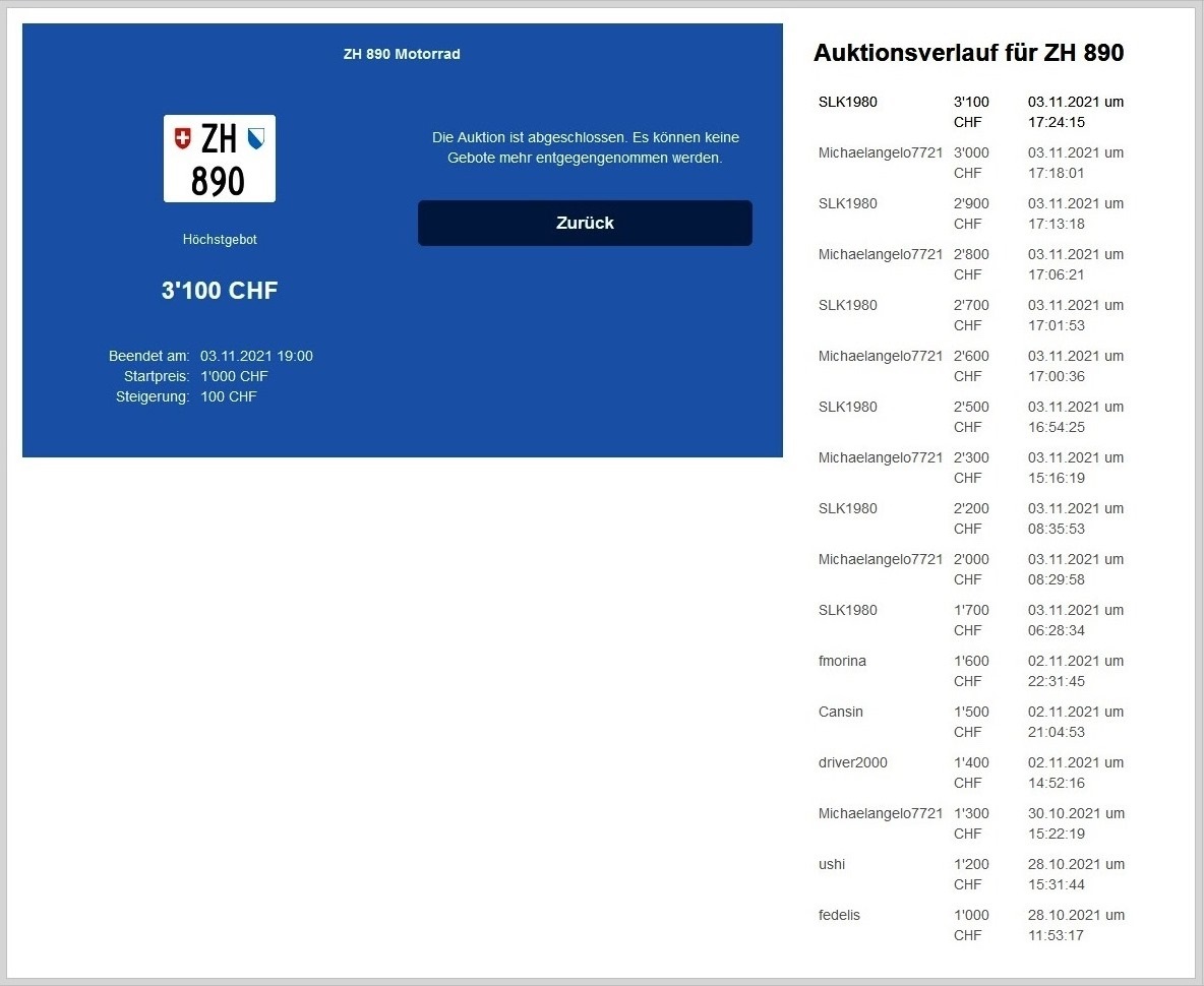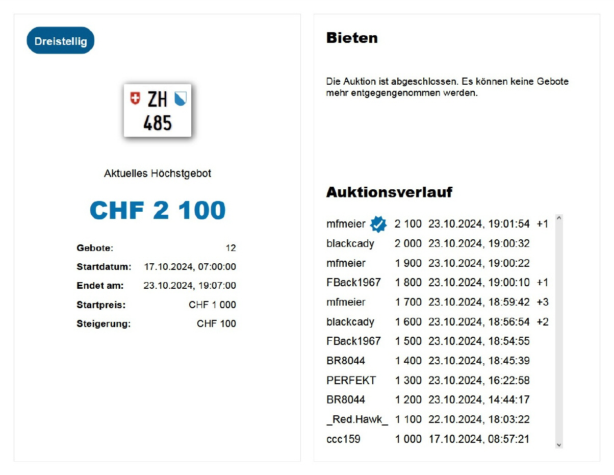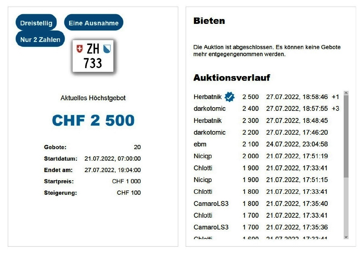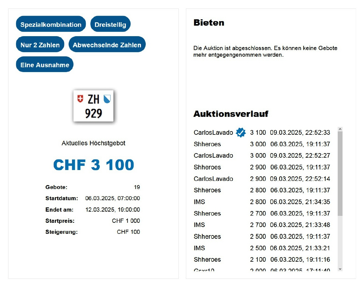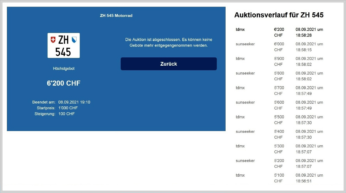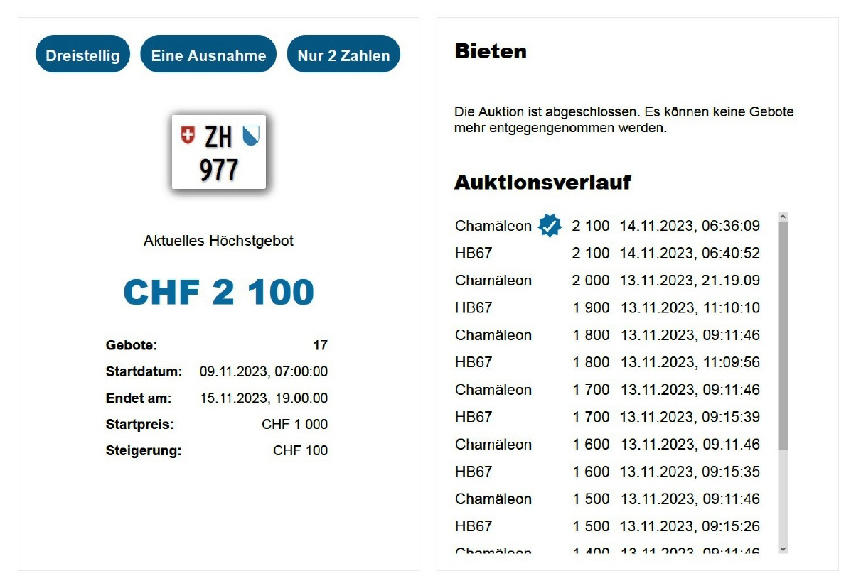 Am 25.11.2020 wurde im Kanton Zürich das 3-stellige TÖFF-Nummernschild ausgegeben - in der Auktion ging es für Fr. 4000.- weg: Auch hier boten sich zwei Bieter hoch! Verfolge den Verlauf vom «ZH 701