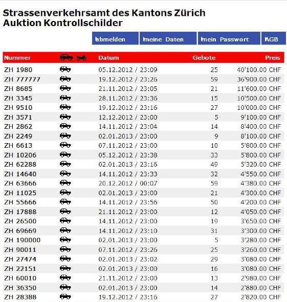 Es ist allein schon interessant, dies zu beobachten. Wenn man sich beim Strassenverkehrsamt einschreibt, bekommt man (wie ich) jeden Montag ein E-Mail zum Einloggen! Passieren tut es dann jeweils am Mittwochabend um 23.00 Uhr - aufgepasst, mitbieten ist gefährlich, Du könntest in den Rausch kommen. Also nur solange mitbieten, als es nicht (oder nur ein bisschen ...) weh tut!