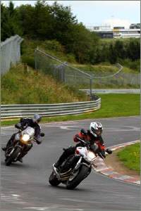 Der angekündigte Ausflug zur legendären Nürburgring-Nordschleife fand 2010 wie geplant statt, für einmal unter besten Wetterbedingungen: Gemeinsam mit dem Schweiz. Motorrad-Fahrlehrer-Verband durfte eine grössere Gruppe diese vier Tage Fahrspass geniessen, zwei davon anlässlich eines durch das Motorrad action-Team ausgerichteten Sicherheitstrainings. Auch wenn der Preis dem einen oder anderen hoch vorgekommen ist, so hatte sich der Einsatz ohne Reue gelohnt: Mein Toyota HiAce-Bus diente als Begleitfahrzeug für Gepäck und, falls notwendig, für ramponierte Fahrzeuge, was glücklicherweise aber nicht nötig war. Auf dem Hinweg waren wir 13 FahrerInnen in der Gruppe, welche ich durch die Vogesen zum Nürburgring führte. Auf dem Rückweg traten wir die Heimreise zu sechst an, diesmal ab Baden-Baden über die Schwarzwald-Hochstrasse. Sigrid, meine Lebenspartnerin, die noch kurz vor der Abreise «passen» wollte («Meine Hornet ist doch kein Renntöff!»), ist noch jetzt bei jeder Erinnerung ganz aus dem Häuschen: Dank ihrem Super-Instruktor, einem deutschen Fahrlehrer, konnte sie sich nach und nach steigern. Sie hat das Töfffahren «neu erlernt» und konnte auf dem Nachhauseweg die Schwarzwald-Hochstrasse so richtig geniessen. Ich nahm die Gelegenheit wahr, die neue Honda VFR 1200 DA mit Automat ausgiebig zu prüfen.