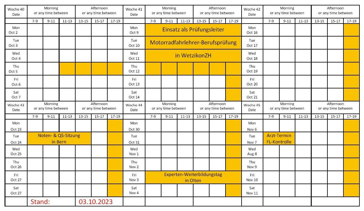 The winter break of the Strassenverkehrsamt Zürich is lasting till April 3rd. I also work in winter, if the temperatures (above 4 degrees, no risk of ice) and good weather conditions. Normally it is very cold in the morning, that's why I make lessons in the afternoon hours. NO MORE NEW CUSTOMERS IN 2023! I am only available for the customers of the past years: 079 333 23 77.