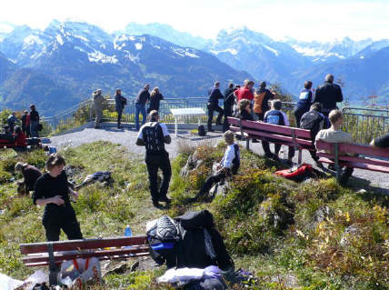 Wer wie vereinbart um 9 Uhr in der «Luegeten» eintraf, wurde für das frühe Aufstehen schlecht belohnt: Die Anlieferung des Brotes erfolgte erst gegen halb 10 Uhr. Dies war dann aber auch die einzige Panne während des ganzen Tages. Nach und nach füllten sich die drei Tische, Der Wintergarten mit der wunderbaren Aussicht auf den Zürichsee und den Obersee ist ein wirklich schöner Ort für den Start unseres Tagesausflugs. Das reichliche Frühstück liess unsere Mägen an den Rand ihres Fassungsvermögens kommen. |
