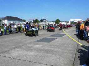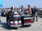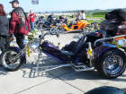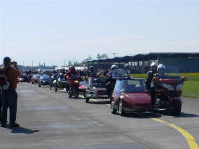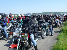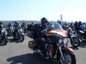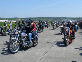 Die Ausfahrt wird in 10 Gruppen zu je 500 Maschinen, also total 5000 Töffs, Trikes, Seitenwagen und andere Zwei- und Drei-Räder, gestartet. Die Strecke ist abgesichert und überall stehen Leute am Strassenrand Spalier. Ein Dorn im Auge für den Veranstalter, der jedes Unfallrisiko vermeiden will, das sogenannte «Abklatschen» der Zuschauer: Speziell Kinder machen sich einen Spass daraus, am Strassenrand die Hand auszustrecken, um möglichst von einem der Ausfahrenden mit der Hand gegrüsst zu werden. Die Ausfahrenden werden gebeten, dies zu unterlassen... |