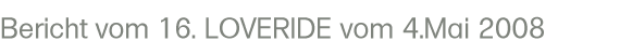 So präsentierte sich der (zum ersten Mal!) verregnete 15.LOVERIDE vor einem Jahr. Doch gegen Mittag verzogen sich die Regenwolken und es wurde am Nachmittag immer schöner - und auch wärmer! Mit einem «Klick» aufs Bild landest Du beim bericht vom 15.LOVERIDE 2007 |