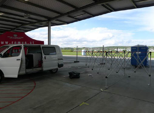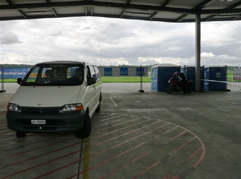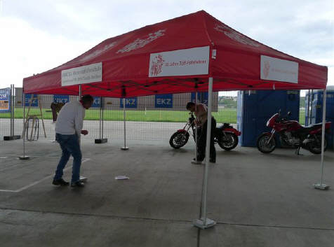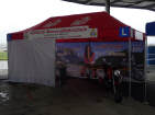 in diesem Jahr bedeutend besser aus. Mit maximal 18 Grad ist es nicht gerade traumhaft, aber in den Töffklamotten wird man bestimmt nicht frieren. Mein angespannter Platz ( neu in der Box 7, weil die offizielle Beschriftung zur Anwendung kommt) in der zweitvordersten Box wurde mir wiederum bestätigt, von der Publikumsseite betrachtet sind wir hinten links (früher jeweils hinten recht!) aber mit meinem roten Zelt nicht zu übersehen.