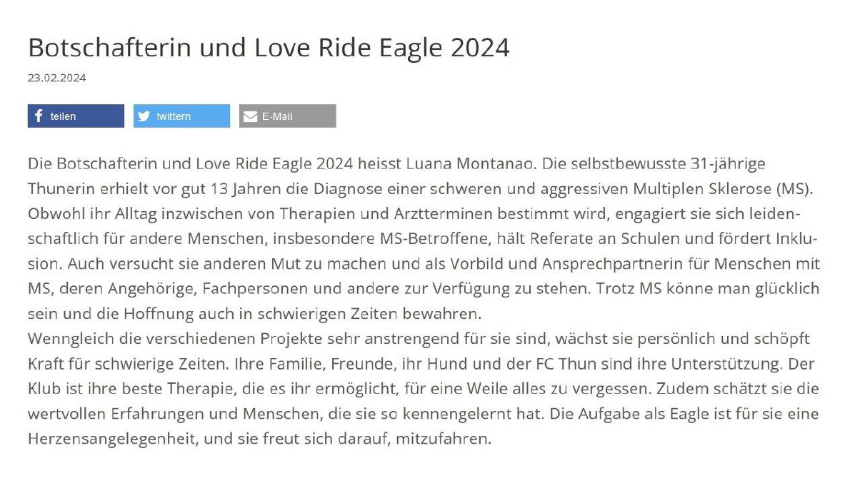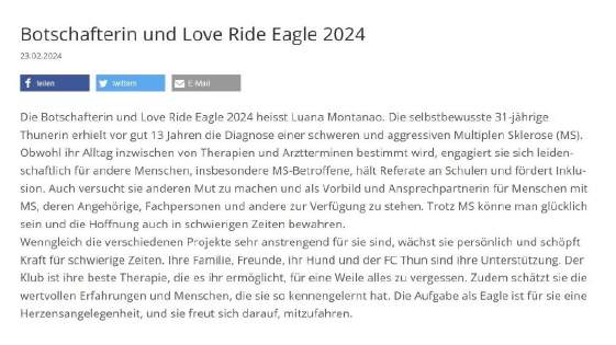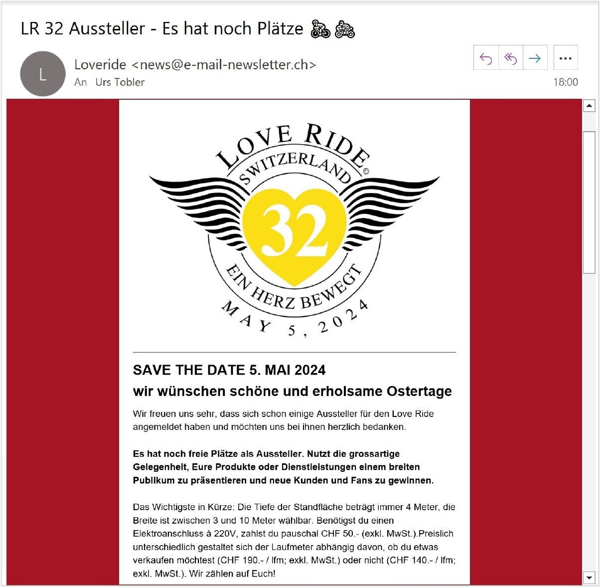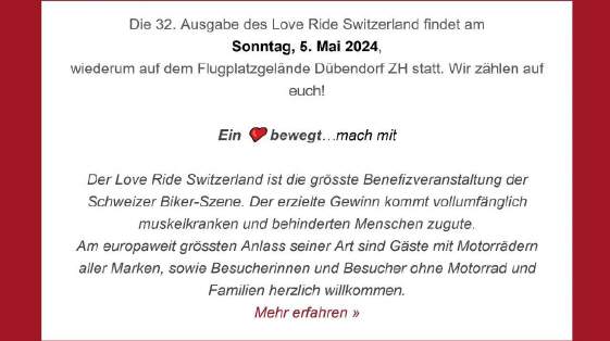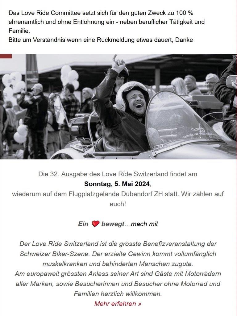 Mehr über den Pfeil oben rechts «Weiter» zu «Welche Ehre für den Verein Love Ride Switzerland» |