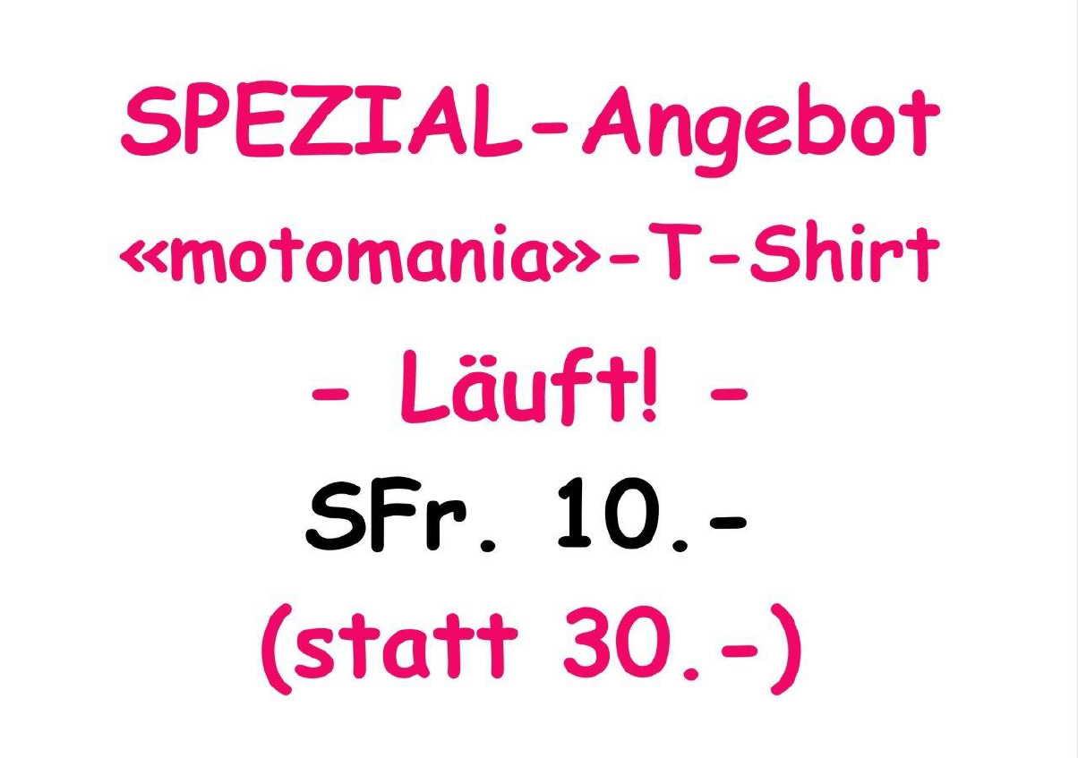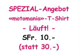 Neu gibts für Aussteller Möglichkeit für Verkauf am Stand: Ich werde sowohl «I-♥-Töff»-Artikel wie auch «motomania»-Tassen und T-Shirts verkaufen, davon habe ich grosse Vorräte noch von der letzten SWISS-MOTO. Das Eintrittsgeld von 30 Fr. /Person geht an Muskelkranke.