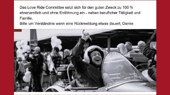 vom LOVERIDE Committee einen Aufruf, nachträglich zu spenden, damit das schlechte Teilnehmer-Resultat (nur etwa 1000 Töffs, 2200 Besucher) für die Empfänger keine Auswirkung hat: Eine unterstützenswerte Idee!