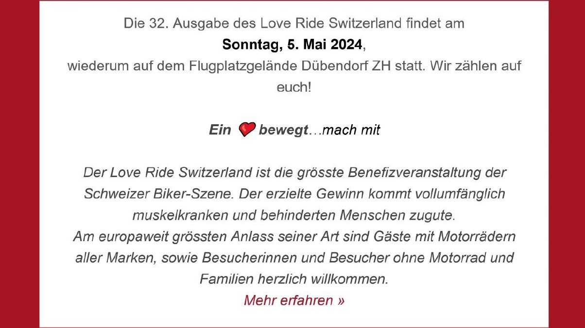LOVE RIDE am Sonntag 8.Mai in Dübendorf