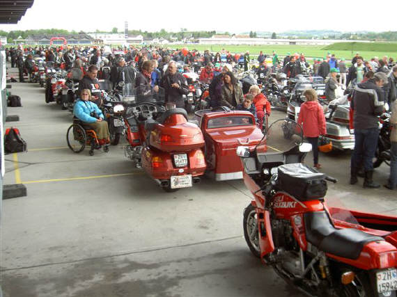 Am Samstag aufstellen bei schönstem Wetter und man weiss bereits: Es wird drehen! Wahrlich eine harte Tasache, doch nicht alle Biker (nur eben extrem viele) liessen sich dadurch den Spass an der Sache nehmen! Doch die behinderten Gäste haben ein Anrecht «auf ihren Anlass» - und sie kamen in Scharen, trotz dem Wetter... Auch für uns war es hart, frühmorgens bei Regen anzufahren: Direkt geregnet hat es ja nicht, wenigstens nicht zum Zeitpunkt, als alles startete. Aber die nasse Fahrbahn, die Kälte und der Wind setzte uns schon zu - den ganzen Tag kamen wir praktisch nicht aus den dicken Kleidern. Am Nachmittag lockerte sich der Wolkenhimmel etwas, aber die Temperaturen stiegen kaum an: Für einmal gab es kaum «nackte Haut» zu sehen! |