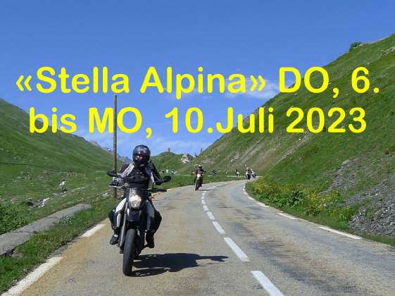 Die alternative Variante der «Stella» ist nun eine 5-tägige Töff-Tour anlässlich der «Stella-Alpina» vom DO, 8.Juli bis MO, 12.Juli: Diese Ausfahrt kann mit jeder Strassen-Enduro oder -Maschine gemacht werden, es besteht die Möglichkeit das Gepäck im Begleitfahrzeug transportieren zu lassen. Der HiAce-Bus dient sowohl als Gepäck-Fahrzeug wie auch als Notfall-Fahrzeug für gestrandete Fahrer(innen) oder Maschinen ...
