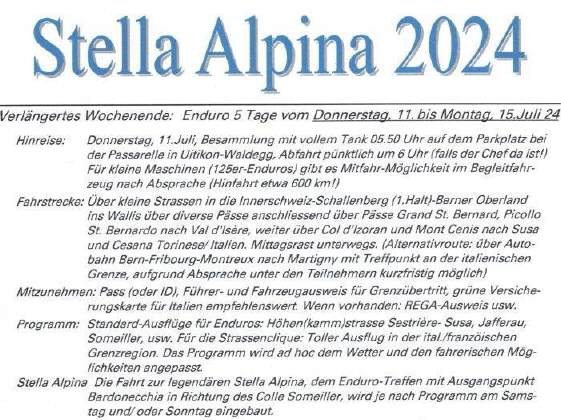 Die alternative Strassen-Variante der «Stella» ist nun eine 5-tägige Töff-Tour anlässlich der «Stella-Alpina» vom DO, 11.Juli bis MO, 15.Juli: Diese Ausfahrt kann mit jeder Strassen-Enduro oder -Maschine gemacht werden, es besteht die Möglichkeit das Gepäck im Begleitfahrzeug transportieren zu lassen. Der HiAce-Bus dient sowohl als Gepäck-Fahrzeug wie auch als Notfall-Fahrzeug für gestrandete Fahrer(innen) oder Maschinen ...