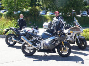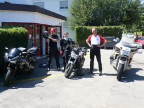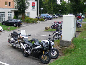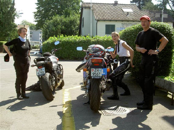 So kam es, dass wir, das war Silvana mit der CBR600F, Dölf mit der 636er-Ninja sowie meine Freundin Sigrid mit ihrer neuen Honda CB600 Hornet und ich mit der Renn-CBR600 (nur auf der Strecke zu fahren!) an der Tramstrasse trafen, um gemeinsam nach Frankreich zu fahren. Gemeinsam? Nicht ganz, da ja Silvana mit ihrem Lernfahrausweis nicht ins Ausland fahren durfte hatten wir den Chauffeur eh!, die Chauffeuse gefunden, die unsere Rennmaschinen nach Frankreich transportierte. Denn ich wollte ja bequem auf der GoldWing zum Ziel fahren... |