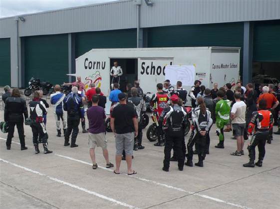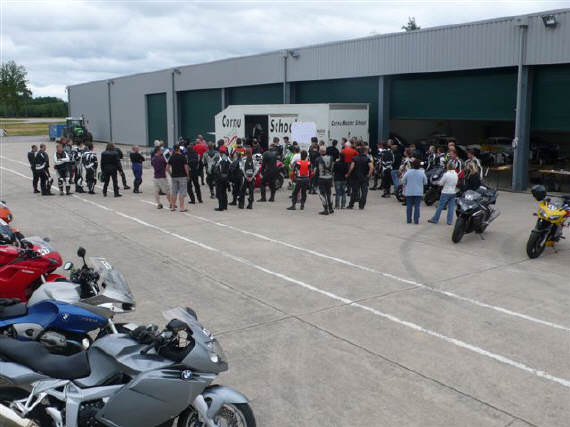 Am Morgen früh nach dem Frühstück waren die Motorräder - Gott sei Dank, was ja in Frankreich nicht immer der Fall ist! - noch da und wir verschoben uns über die Autobahn zur Rennstrecke. Der zweite Tag von Jacques Trainiing war «Freies Training», doch auch dazu gab es Regeln zu beachten. So startete er denn mit einer Theorie und danach ging es, in unserem Fall, durch ihn persönlich geführt auf die uns komplett neue Strecke: Jeder dirfte eine Runde direkt hinter Jacques fahren, dann war ich gefordert, seine Aufgabe für «meine Schäfchen» zu übernehmen. |