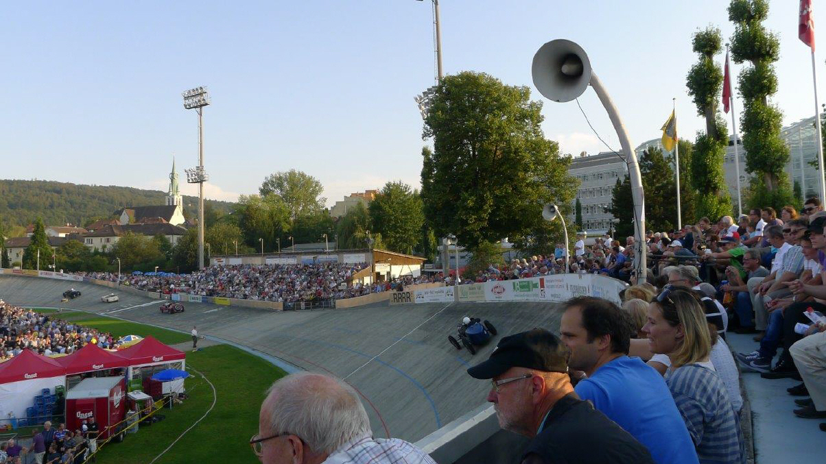 Der Abend war bei diesem Wetter fantastisch: Abwechslungsweise wurden verschiedene Rennen gezeigt, neben den Schauläufen der historischen Rennfahrzeuge. Die Steher-Rennen, mit den sonoren Töff-Motoren, die in ihrem Windschatten die Topspeed-Velofahrer mitziehen, die nicht «von der Rolle gheie» sollten ... Davon kommt dieser landläufige Spruch, wer weiss das schon in der heutigen modernen Zeit? Hier noch ein Bilder vom Abend, zu beachten die einbrechende Dunkelheit: Was für eine tolle Stimmung!